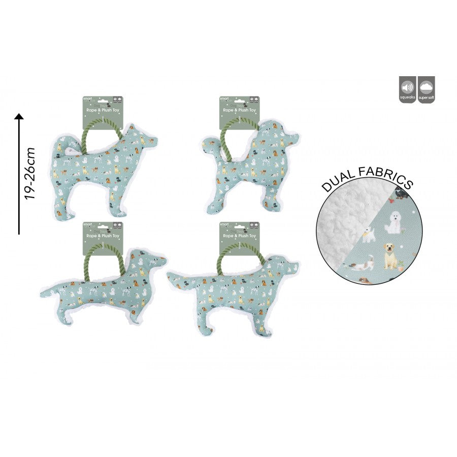 A great gift for your pet, this dog print plush and rope dog toy with squeaker is sure to keep your dog occupied and entertained. Available in 4 dog print designs they also feature a green rope handle and a white sherpa fleece reverse.