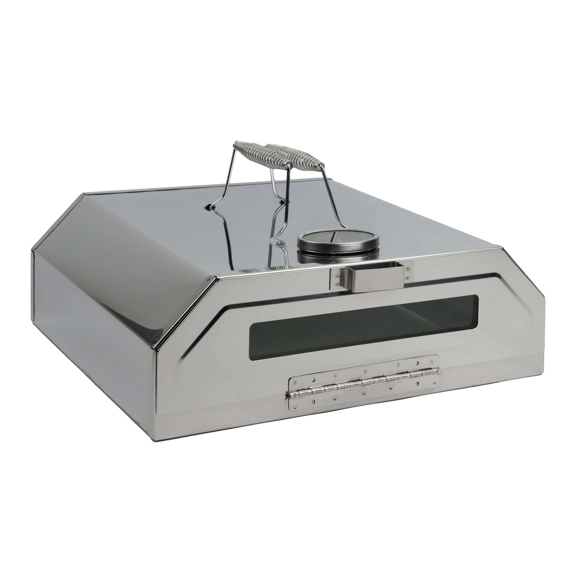Quick to heat, the oven uses convective, radiant and conductive heat to raise the cooking temperatures up to 450 degrees. The integrated temperature gauge will show you what temperature the pizza box has reached, ranging between 50-450°. The design also features a magnetic door, complete with a glass viewing window, allowing you to check the progress of your pizza without releasing any heat.